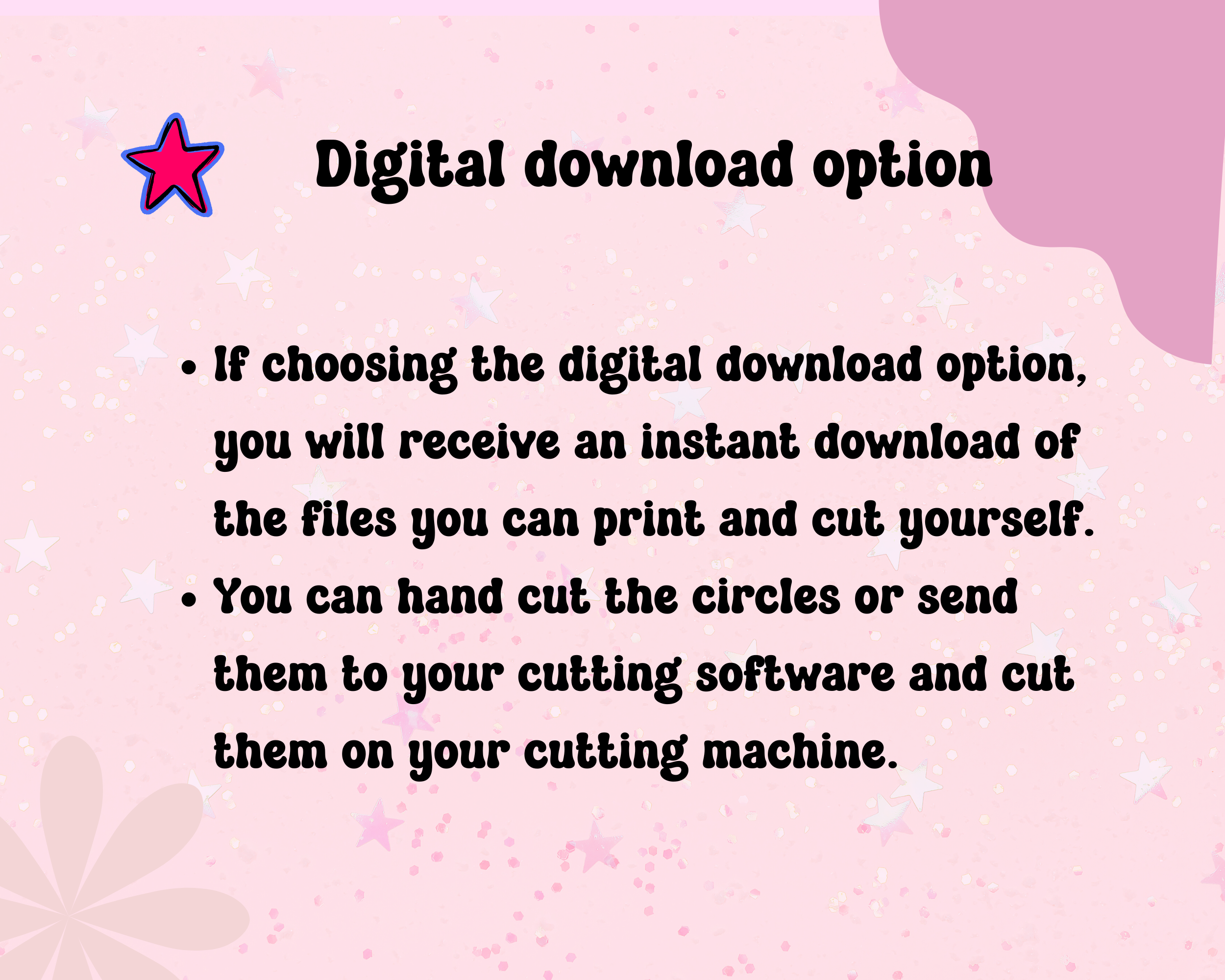 Available as either a digital download where you can print and cut as many as you like yourself or as a shipped item we will make and ship to you!