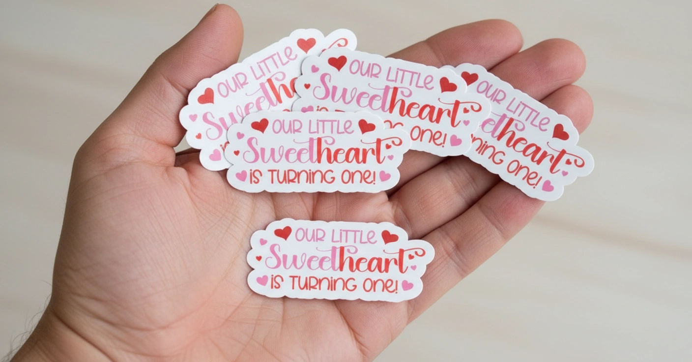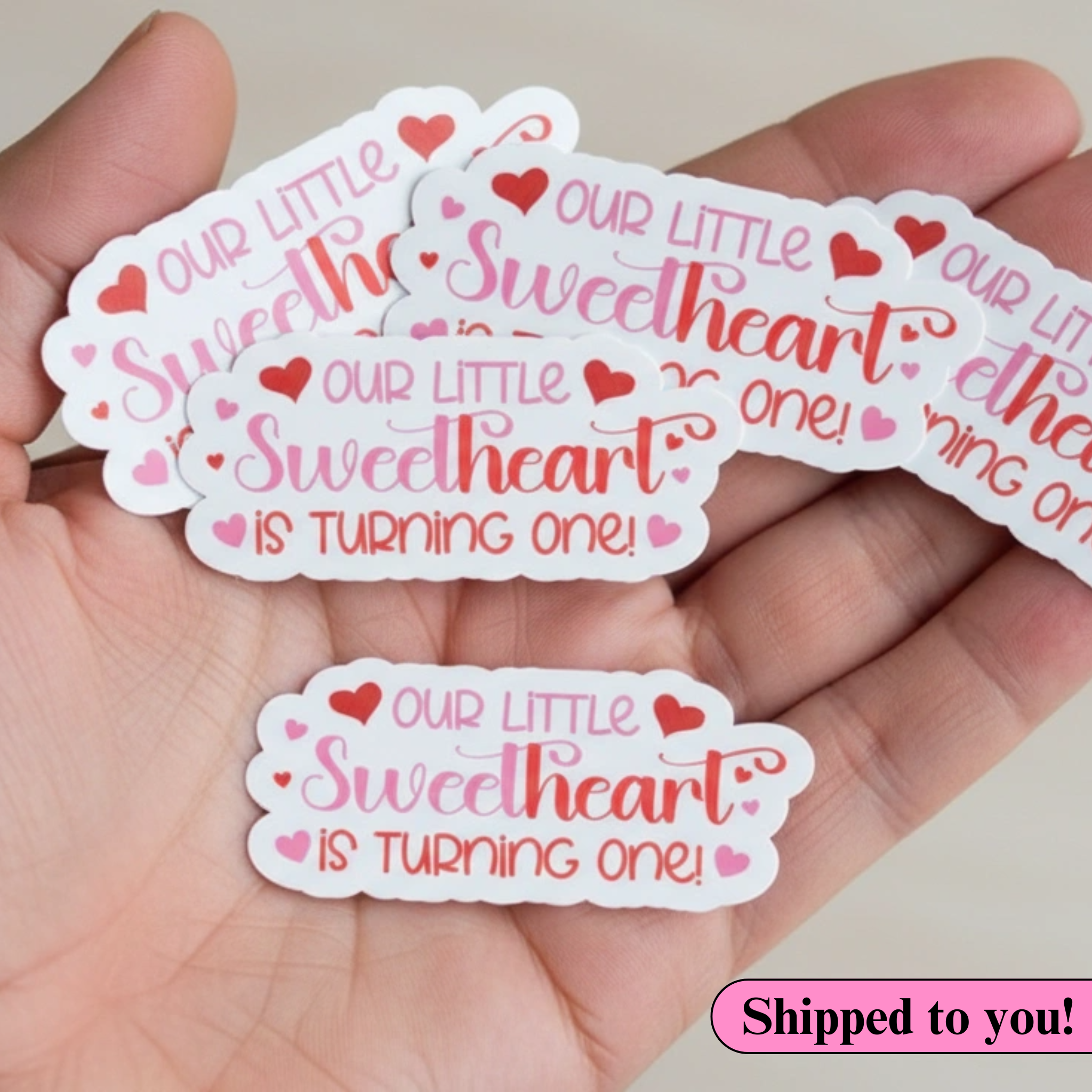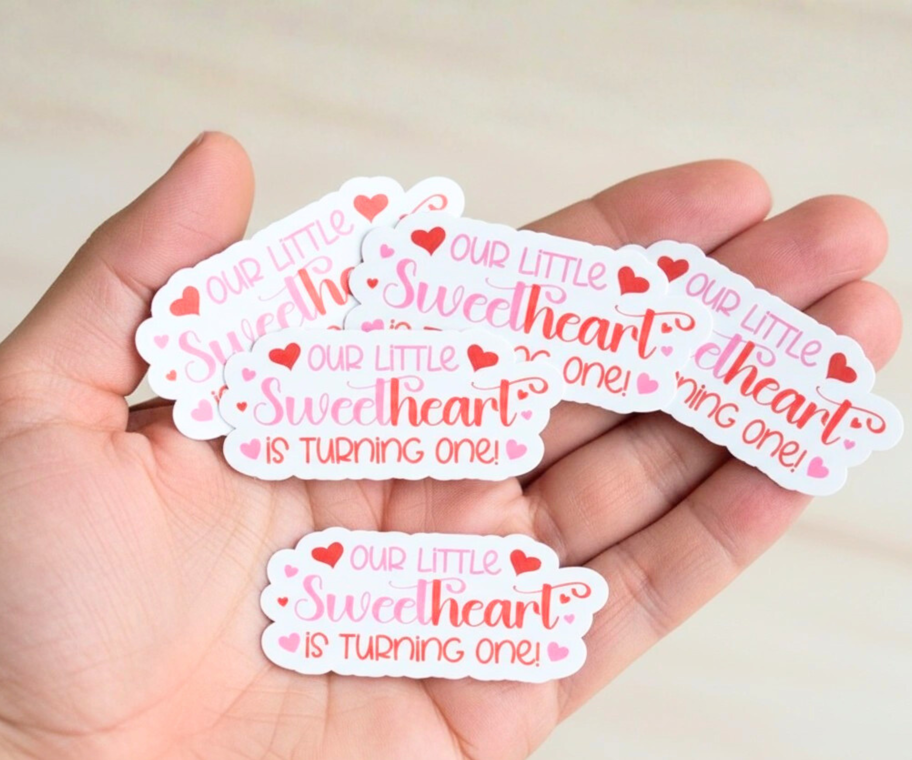 Dress up your Valentine baby's party table with these sweet confetti pieces. The confetti says "Our Little Sweetheart is Turning One." Perfect for a valentine first birthday party