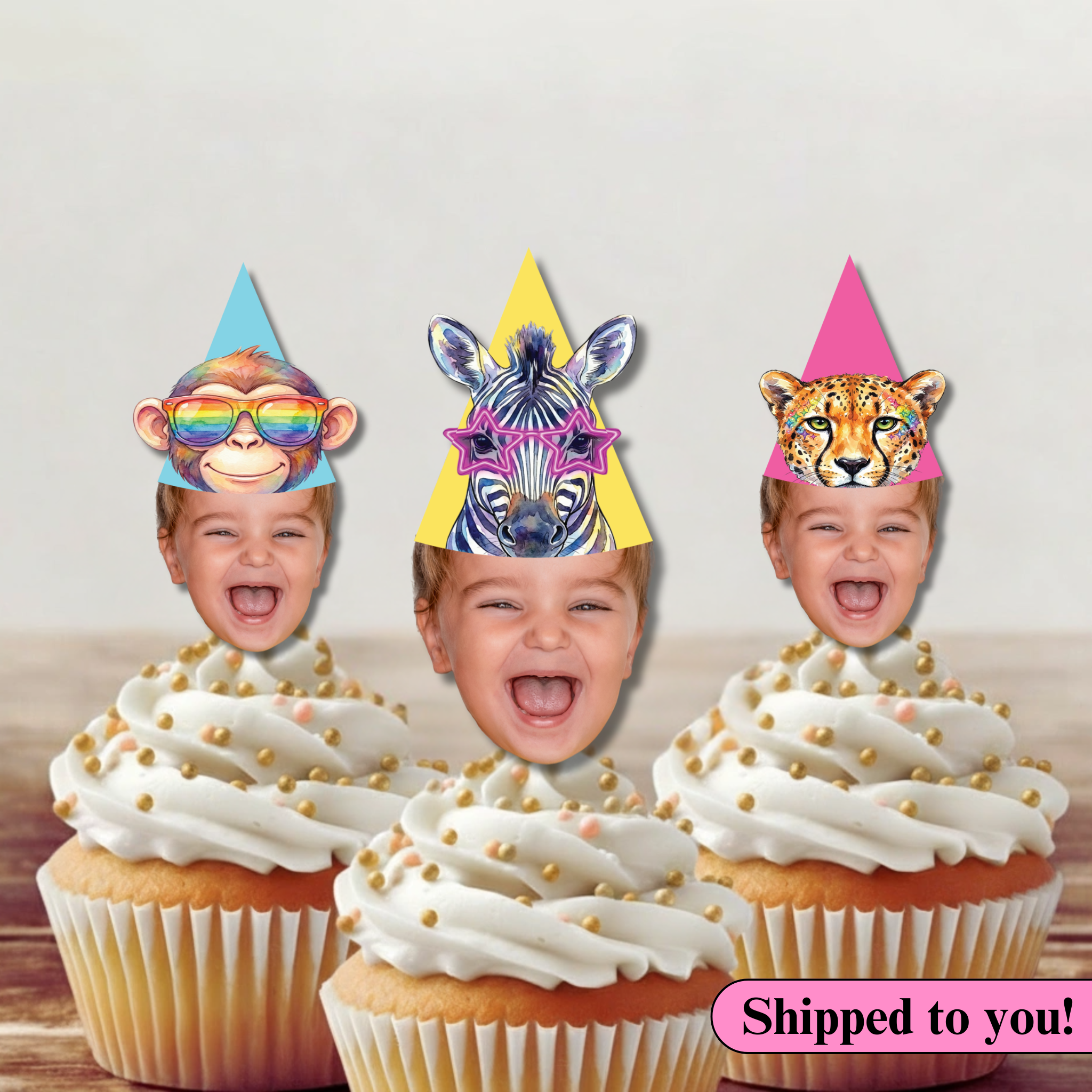 These adorable party animal cupcake toppers are the perfect add on to a jungle themed birthday party celebration.  They are customized with the photo of your choosing.