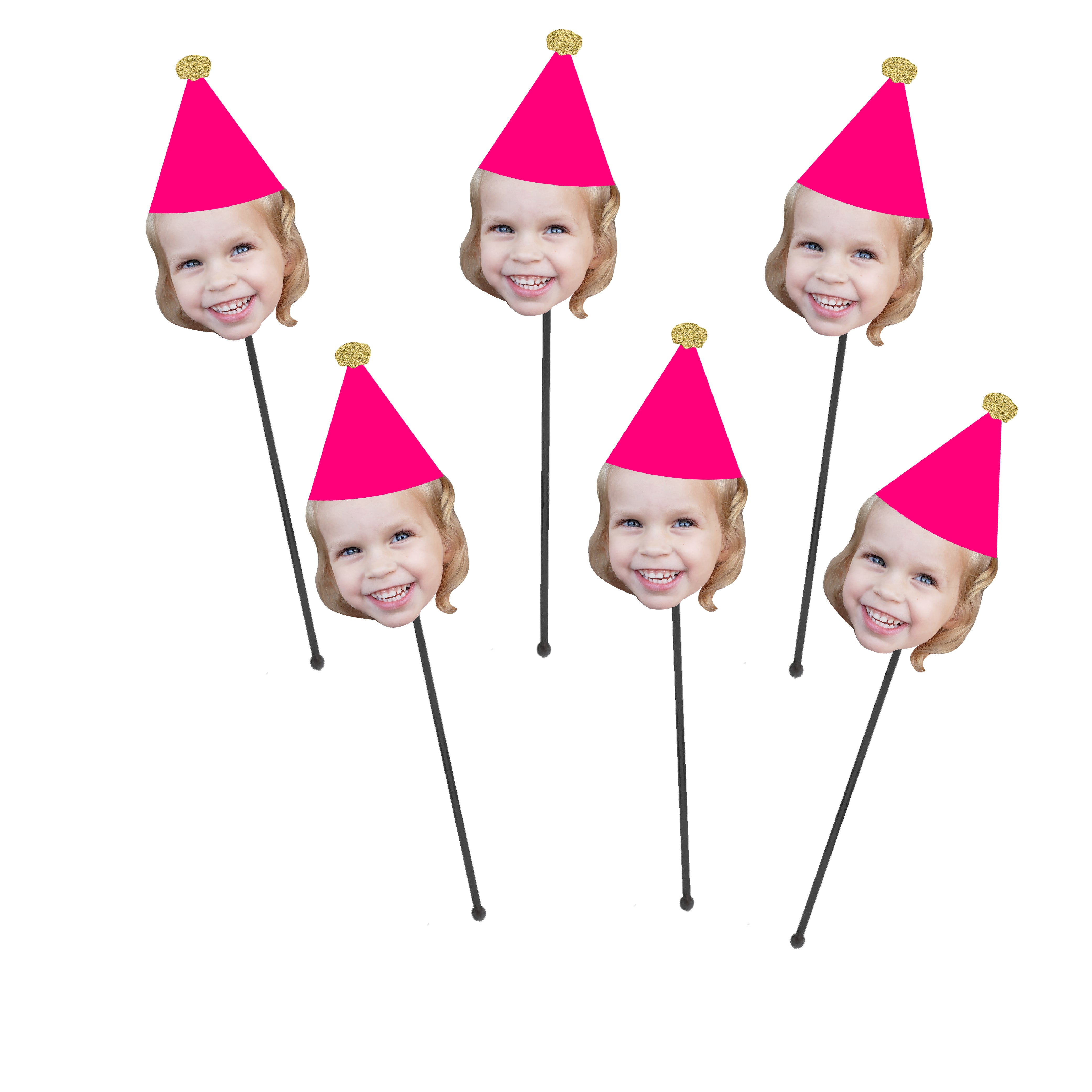 Make your birthday party extra special with these custom face drink stirrers with a hot pink birthday hat on top.