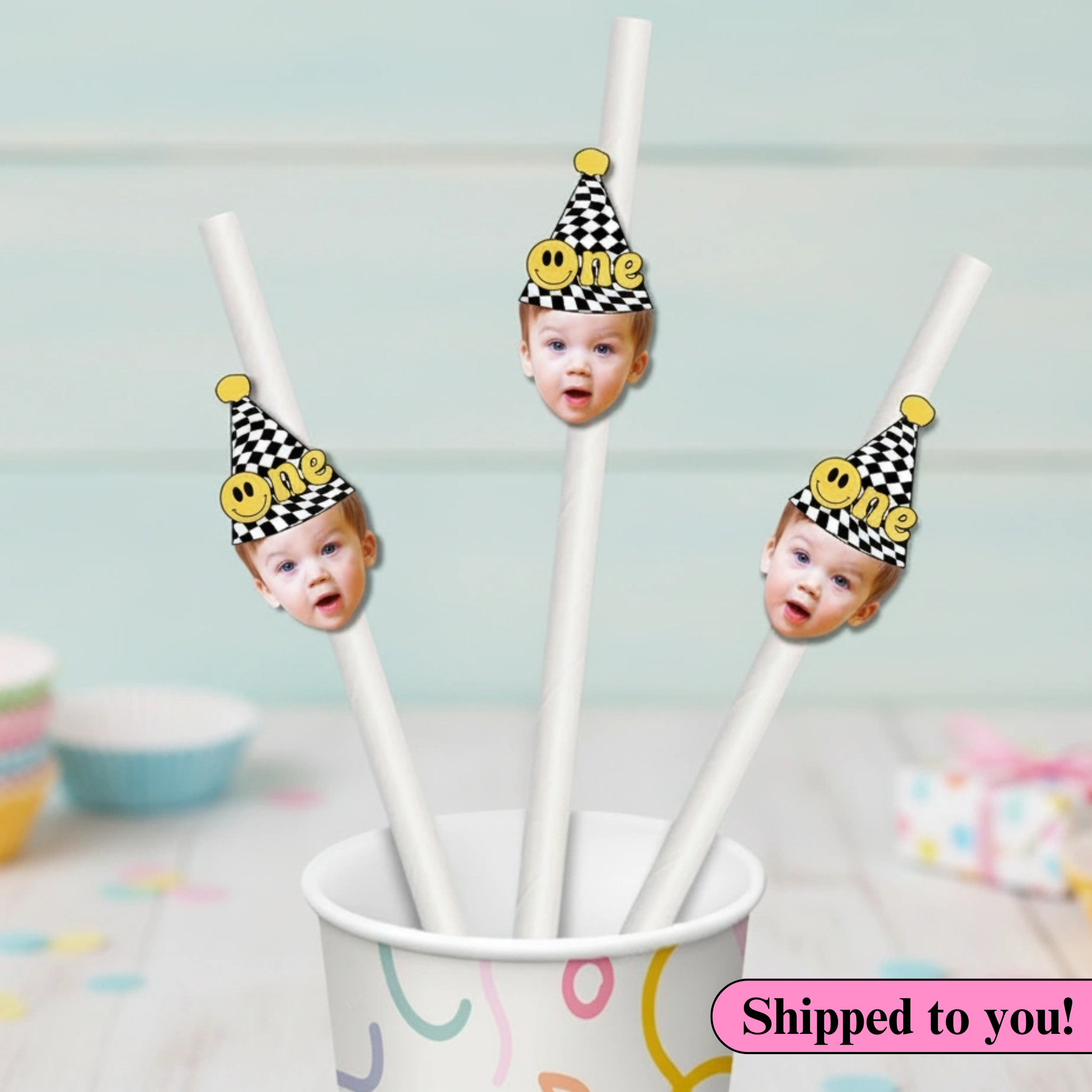These straws are a great addition to a One Happy Dude or One Cool Dude Party! It is adorned with the photo of your choosing and a black and white party hat with a yellow one and smiley face.