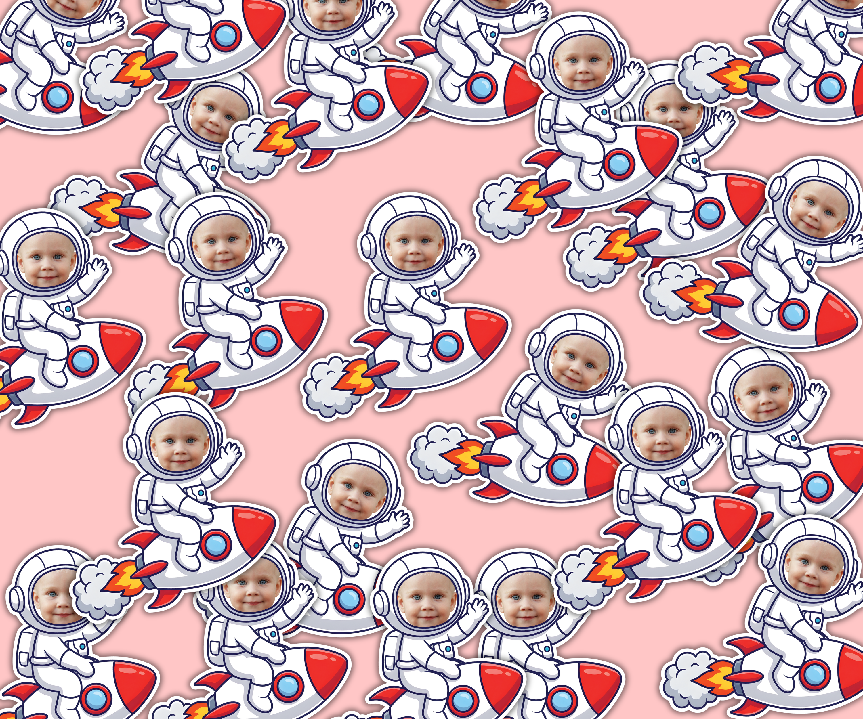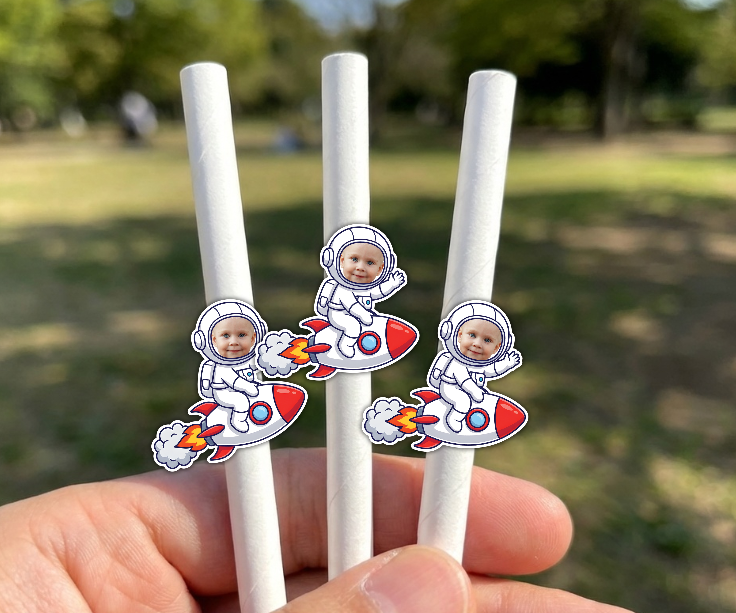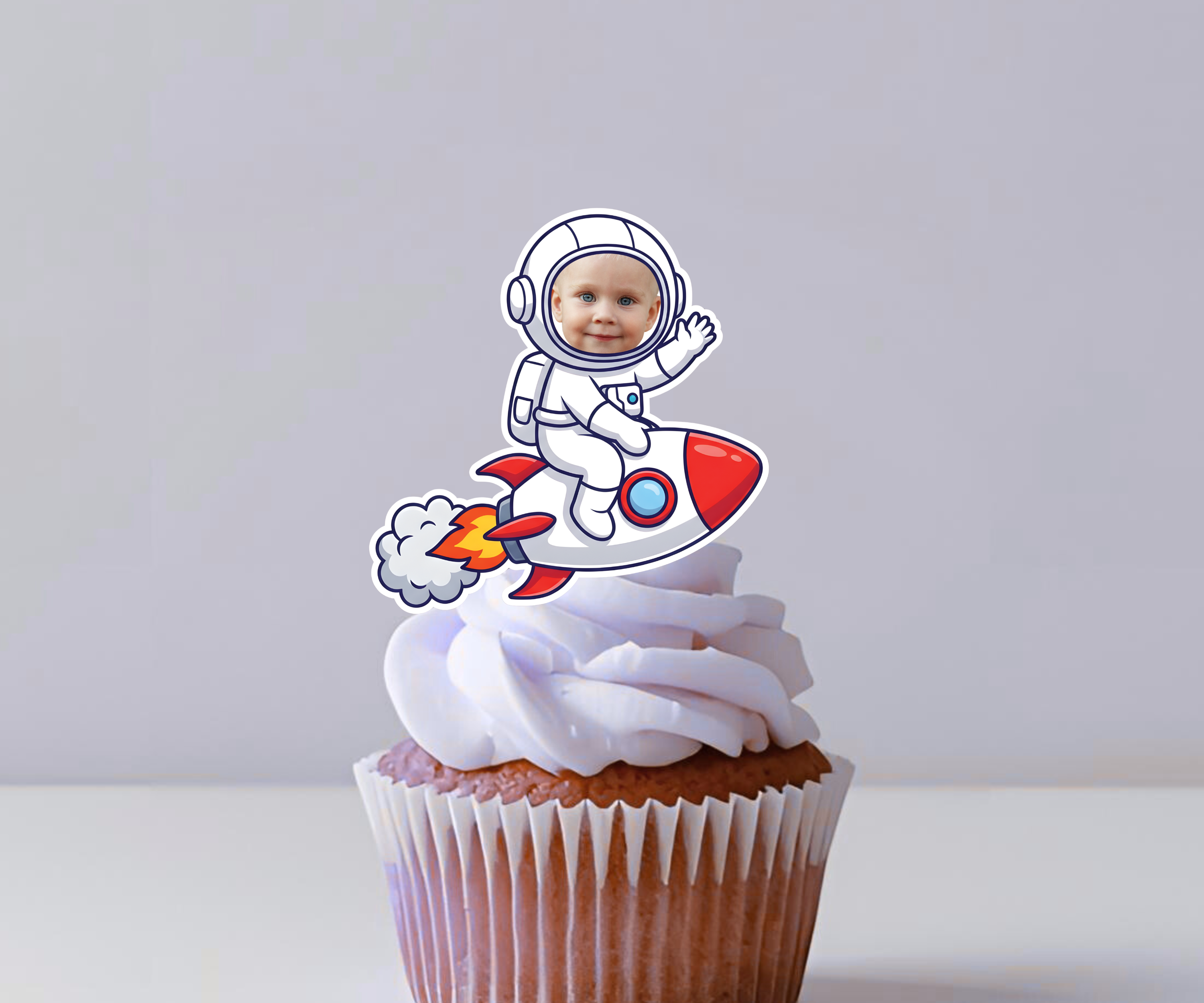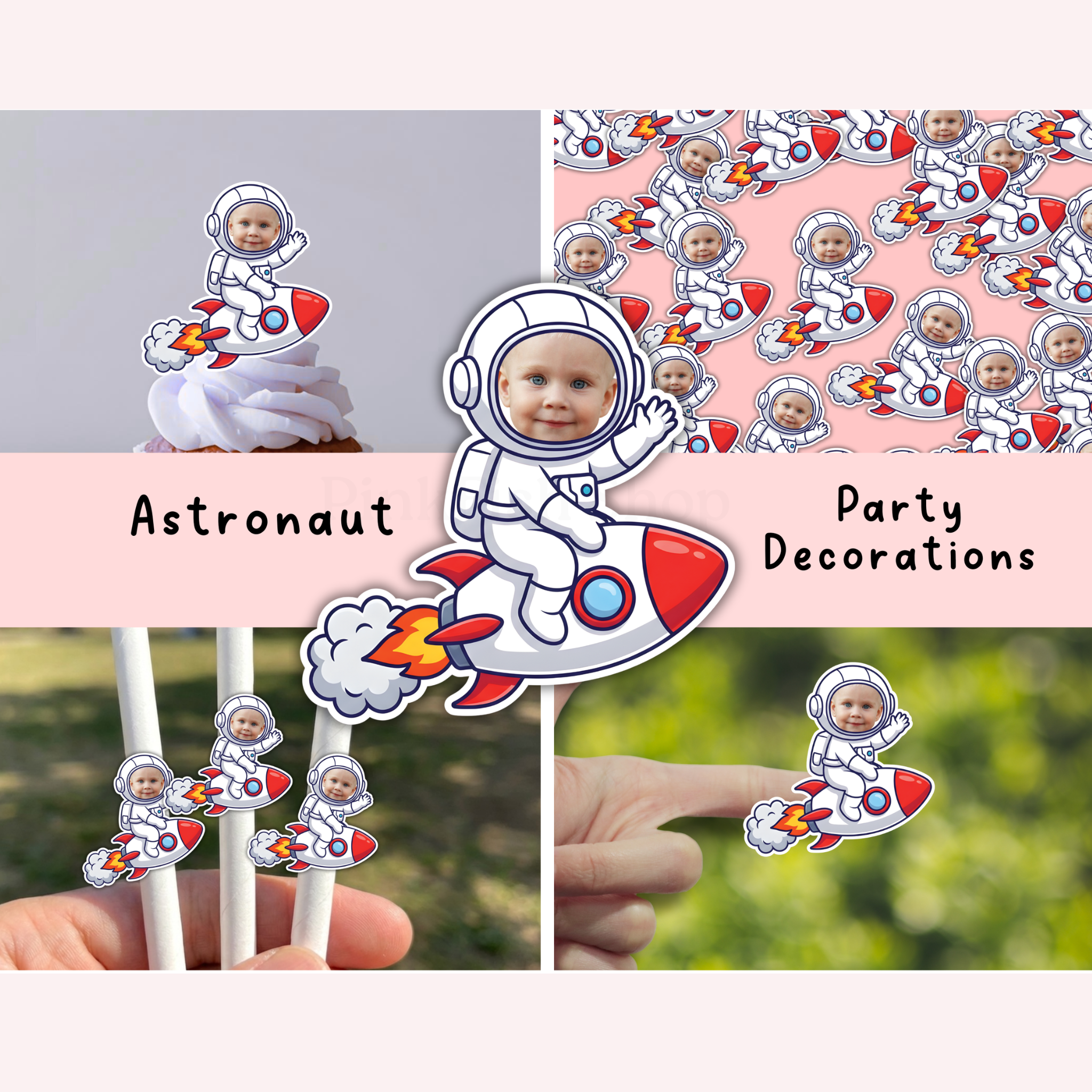 These personalized Astronaut decorations are great for any space themed party! You can choose between face banners, face cupcake toppers, face drink stirrers, face straws, face stickers and face confetti customized with a photo of your choosing and a fun design of an astronaut riding a rocket. Add several items to your cart for a whole theme!