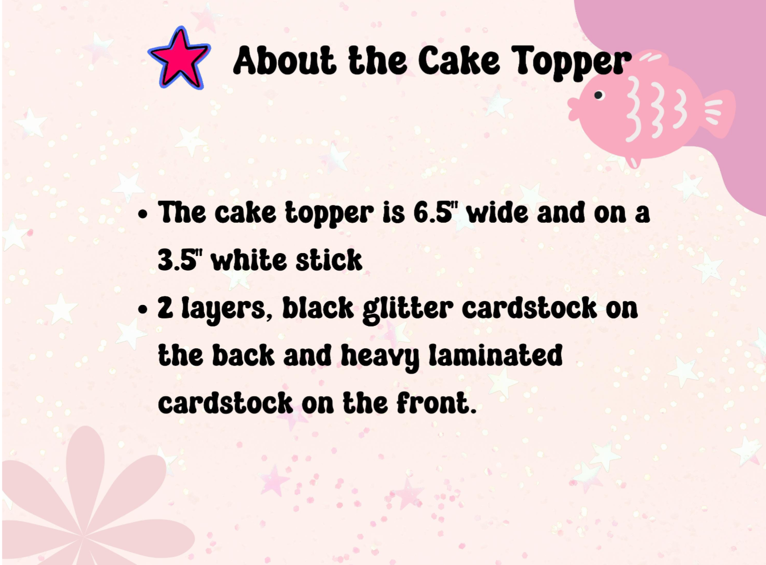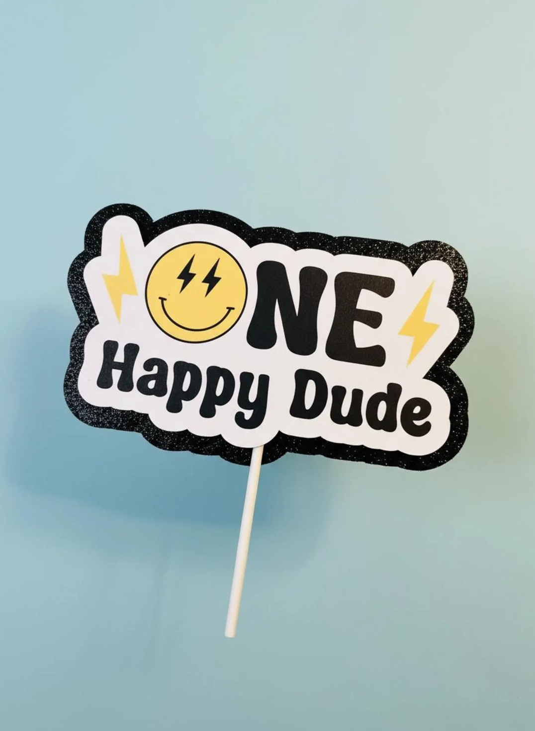Make your One Happy Dude party extra cool with this adorable cake topper. This cake topper is 2 layers with a heavy black glitter cardstock at the back and a laminated cardstock image on the front. Cake topper is 6.5" wide and single sided.