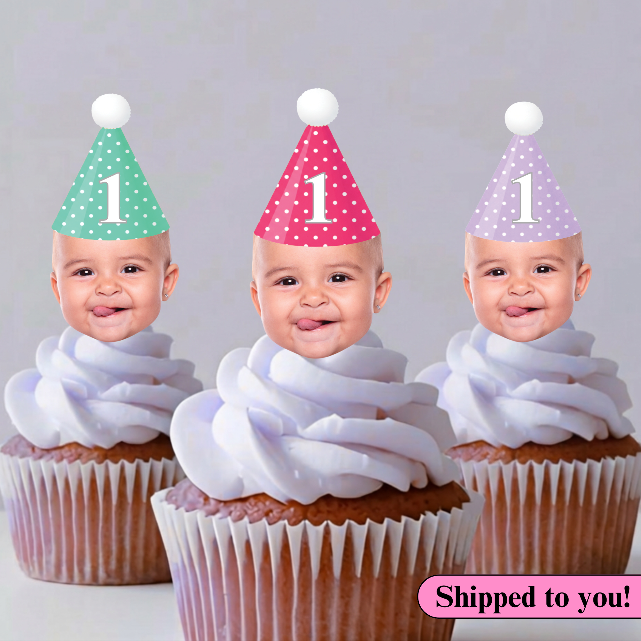 This listing is for 12 custom face cupcake toppers with a birthday hat on top. Great for any birthday party. You can choose to have one color hat or a mix of all 4. You can choose to have a number on the hat (in white) or no number.